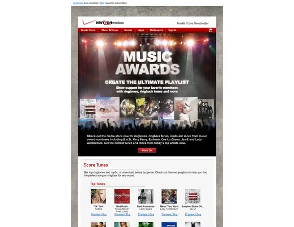 The email from Verizon Wireless highlights a collaboration with the Grammy Awards.